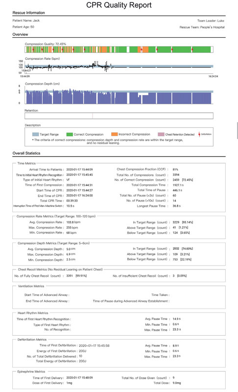 CCF、圧迫率、圧迫深さ、中断時間、最初の心拍リズム認識時間、最初の除細動時間など。